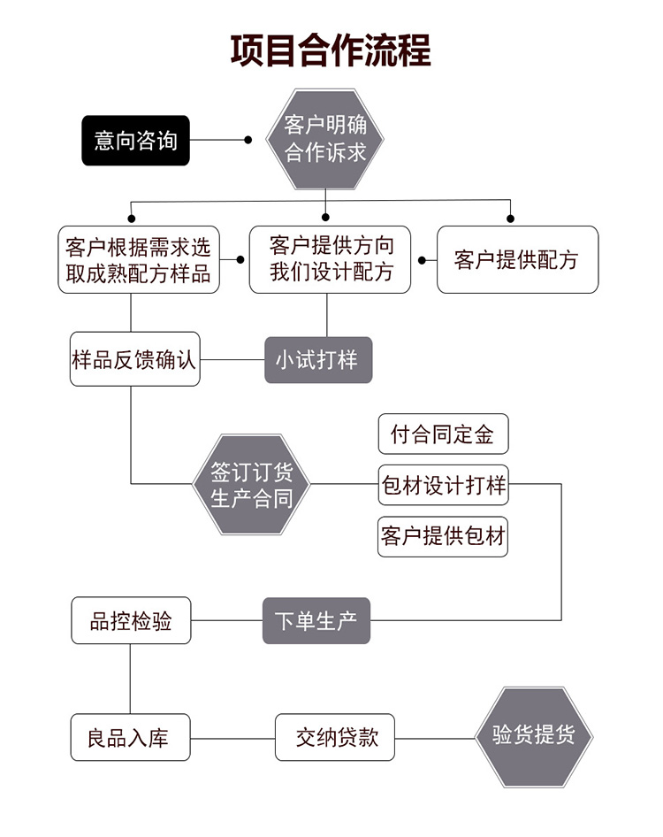 2、客戶自帶品牌、包裝材料和產(chǎn)品配方,我方提供原料及產(chǎn)品加工;