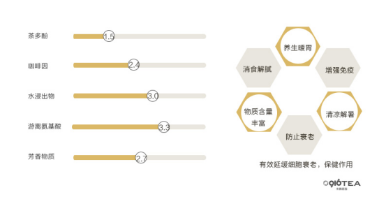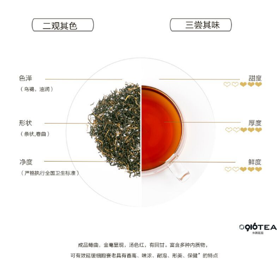 成品蜷曲,金毫顯現(xiàn),湯色紅,有回甘。富含多種內(nèi)質(zhì)物,可有效延緩細(xì)胞衰老具有香高、味濃、耐泡、形美、保健”的特點(diǎn)