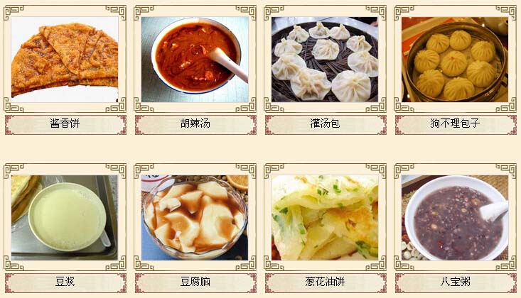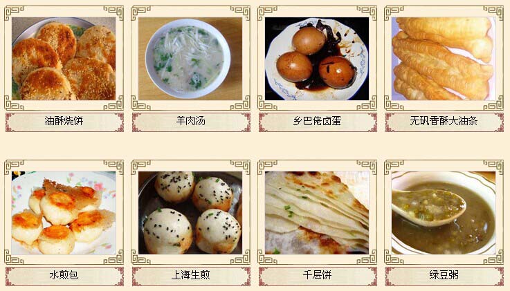 1.逍遙鎮(zhèn)胡辣湯 2.三鮮豆腐腦 3.四輩水煎包 4.東北金絲餅(手抓餅) 5.蔥花油餅 6.油酥燒餅 7.千層大餅 8.美味豆?jié){ 9.八寶粥 10.綠豆粥 11.南瓜粥 12.玉米粥 13.小米粥 14.黑米粥 15.雞蛋甜湯 16.營養(yǎng)粥 17.糖糕 18.菜角 19.鄉(xiāng)巴佬鹵蛋 20.糊涂面條