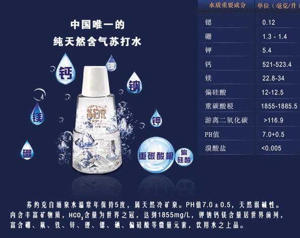 蘇約克屬于罕見的小分子團(tuán)水,能迅速滲透細(xì)胞膜被人體吸收,活化細(xì)胞,增強(qiáng)免疫力和新陳代謝,加速排毒,美容養(yǎng)顏。 蘇約克內(nèi)含豐富礦物質(zhì),hco3— 離子含量是飲用水的世界之冠,達(dá)到1885mg/l,鉀 鈉鈣鎂含量居世界前列,富含硼、氟、鐵、鋅、鋰、鍶、硒、偏硅酸 等微量元素 ,其中氟元素 含量達(dá)0.5mg/l,能強(qiáng)壯骨骼,對(duì)結(jié)石病有分解和排除作用;硼元素 達(dá)到醫(yī) 用標(biāo)準(zhǔn)的1.8 mg/l,能促進(jìn)睪丸甾酮 的分泌,強(qiáng)化肌肉和生命活力。