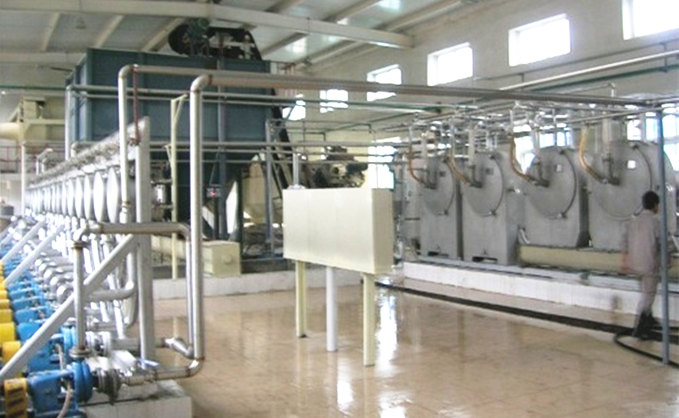 本工藝采用2臺(tái)串聯(lián)xs-1200型鼠籠式清洗機(jī)就行連續(xù)清洗。洗滌時(shí),槽體中預(yù)先裝滿洗滌用水,由上道工序除石機(jī)出來(lái)的物料自流到洗薯機(jī),從轉(zhuǎn)鼓的一端進(jìn)料,薯塊在轉(zhuǎn)鼓中不斷地互相碰撞、摩擦、逐漸洗凈。同時(shí)在轉(zhuǎn)鼓內(nèi)側(cè)裝有螺旋使物料徐徐前進(jìn),經(jīng)過(guò)幾分鐘到達(dá)轉(zhuǎn)鼓的另一端,陸續(xù)被轉(zhuǎn)鼓撈斗撈出水面,洗下的泥沙污物聚集于漏斗之中上,每隔1小時(shí)開(kāi)一次排污閥排放泥沙污物。