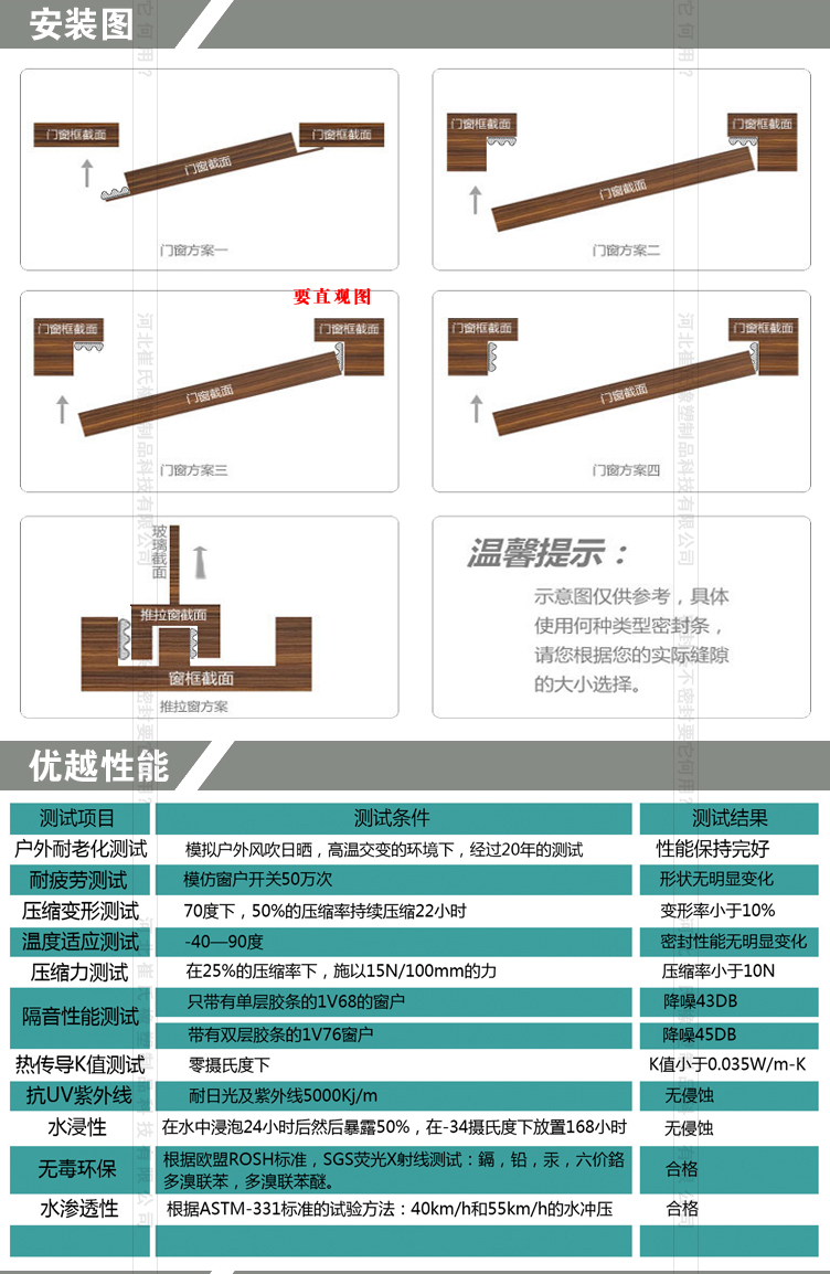 包覆式密封條在耐老化、耐疲勞、壓縮變形測試、壓縮力測試、熱傳導(dǎo)k值測試、水侵性、水滲透性等測試中均取得超越所有傳統(tǒng)產(chǎn)品的優(yōu)秀的結(jié)果;同時(shí)包覆式密封條節(jié)能環(huán)保、隔音降噪、抗強(qiáng)紫外線,無毒、不與任何油漆、清潔劑 發(fā)生反應(yīng),迎合新時(shí)代綠色健康主題。
