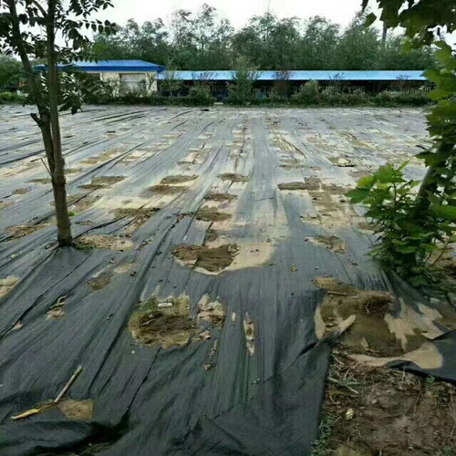 大部分地區(qū)為了防治雜草生長(zhǎng),阻止植物根系鉆出地面,一般采用吹塑的pe膜(黑色或者白色的塑料膜)作為防草布,由于pe膜是透明的,陽(yáng)光能夠透過(guò)pe膜照射到pe膜下面的雜草,雜草能進(jìn)行光合作用,起不到防雜草生長(zhǎng)的作用,而且這種pe膜的密封性較好,透氣性較差,滲水能力不足,使得植物根部的吸水能力不足,影響植物的生長(zhǎng),透氣性較差地溫增高也可能導(dǎo)致植物的根部腐爛。pe膜壽命短,基本一年就壞了,勞動(dòng)成本高。
