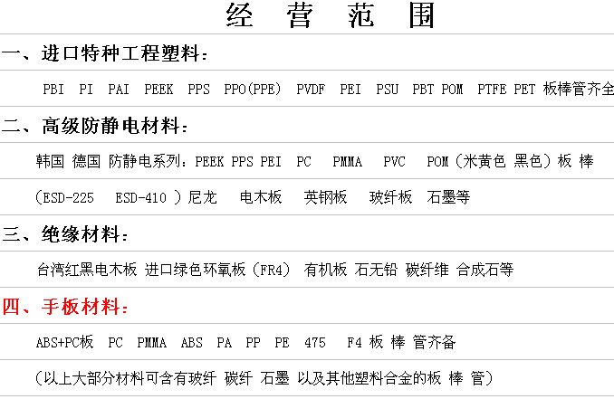 氟 塑 料:聚四氟乙烯(ptfe)、聚偏氟乙烯(pvdf)、聚全氟乙烯丙烯(fep)、四氟乙烯與全氟烷基乙烯基醚共聚物(pfa)薄膜、板、棒、管等制品。