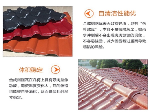 合成樹(shù)脂瓦是運(yùn)用高新化學(xué)化工技術(shù)研制而成的新型建筑材料,具有重量輕、強(qiáng)度大、防水防潮、防腐阻燃、隔音隔熱等多種優(yōu)良特性,普遍適用于開(kāi)發(fā)區(qū)平改坡、農(nóng)貿(mào)市場(chǎng)、商場(chǎng)、住宅小區(qū)、新農(nóng)村建設(shè)、高檔別墅、雨篷、遮陽(yáng)篷、仿古建筑等。