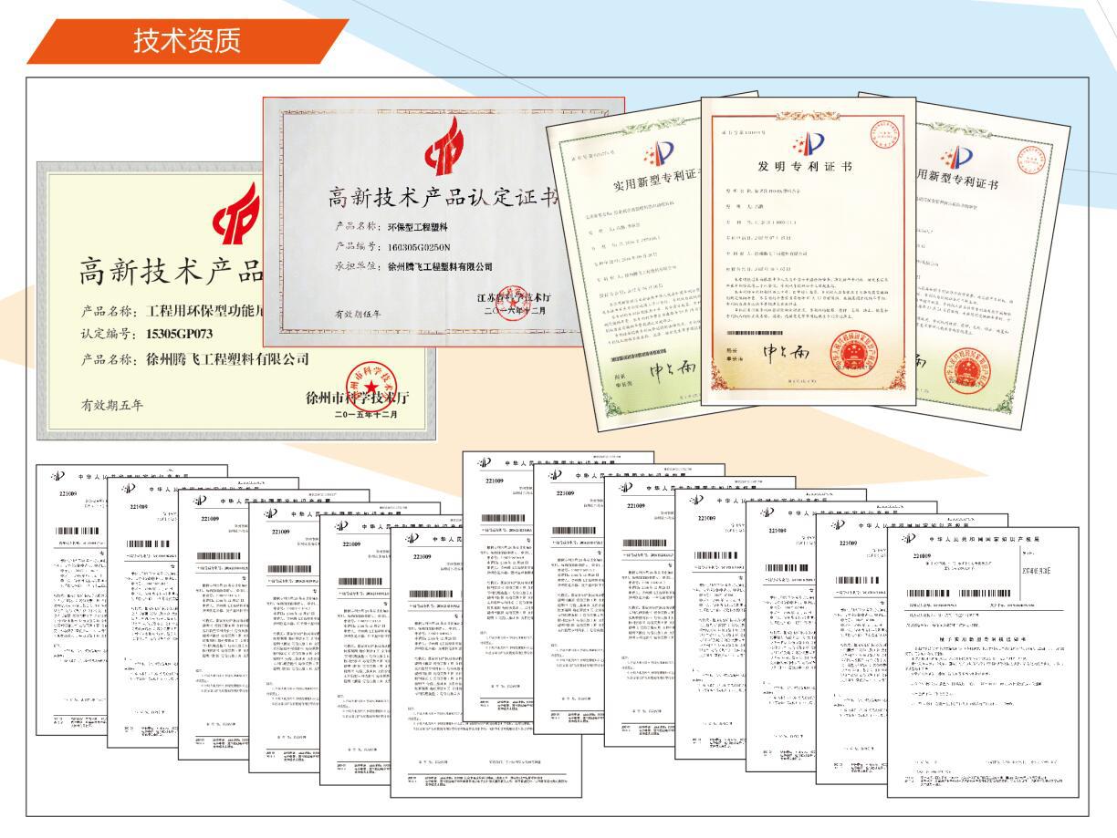 徐州騰飛工程塑料有限公司擁有專業(yè)的研發(fā)團(tuán)隊(duì),根據(jù)客戶要求定制開(kāi)發(fā),快速提供樣料試樣,滿足客戶新產(chǎn)品開(kāi)發(fā)要求。專業(yè)的檢測(cè)人員對(duì)每一批產(chǎn)品進(jìn)行全性能檢測(cè),質(zhì)量好,有保障。公司已通過(guò)高新技術(shù)企業(yè)認(rèn)定,iso9001質(zhì)量管理體系認(rèn)證,ts16949體系認(rèn)證,被評(píng)為改性塑料工程技術(shù)研究中心,擁有專業(yè)的voc氣味檢測(cè)實(shí)驗(yàn)室,同時(shí)獲得多項(xiàng)發(fā)明專利以及實(shí)用新型專利授權(quán)。