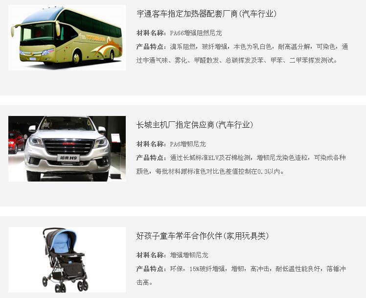 阻燃尼龍可分為無(wú)鹵阻燃尼龍和玻纖增強(qiáng)阻燃尼龍,其中無(wú)鹵阻燃尼龍中應(yīng)用較廣的無(wú)鹵阻燃劑 是紅磷和三聚氰 胺 鹽 類,無(wú)鹵阻燃尼龍產(chǎn)品阻燃性能優(yōu)異,阻燃級(jí)別達(dá)到 ul94v0級(jí),具有沖擊強(qiáng)度高、電氣性能和耐熱性優(yōu)良,對(duì)環(huán)境無(wú)污染,環(huán)保,適合做電氣接插件。通過(guò)添加符合歐洲r(nóng)ohs標(biāo)準(zhǔn)的溴 系阻燃劑 或無(wú)鹵阻燃劑 ,以提高復(fù)合材料的阻燃性能。玻纖增強(qiáng)阻燃尼龍材料中不同含量玻纖、礦粉 增強(qiáng)填充尼龍材料,主要包括玻纖增強(qiáng)填充pa6、玻纖增強(qiáng)填充pa66兩大系列,具有高強(qiáng)度、高韌性、高耐熱、耐磨、耐腐蝕并具有良好的尺寸穩(wěn)定性以及成型工藝性?梢杂米⑸、模壓、擠出等方法成型,廣泛應(yīng)用于汽車接插件,機(jī)械部件,電子電器產(chǎn)品等。