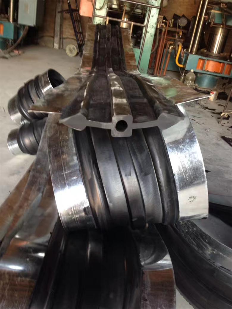 材料的選擇及要求鋼邊:選用鍍鋅鋼邊;橡膠:通常選用天然橡膠、氯 丁橡膠、三元乙丙橡膠等。要求橡膠和鋼邊能有效地粘結,它們之間的粘結強度(剝離強度)應達80~10n/2.5mm,以使它們在外界條件變化情況下不被拉脫。通常鋼邊邊緣沒有工藝孔,安 裝澆筑混凝土時,利用工藝將止水帶和鋼邊用細鐵絲纏繞固定,以保證澆搗密實,使鍍鋅鋼片和混凝土有效地牢固粘附。