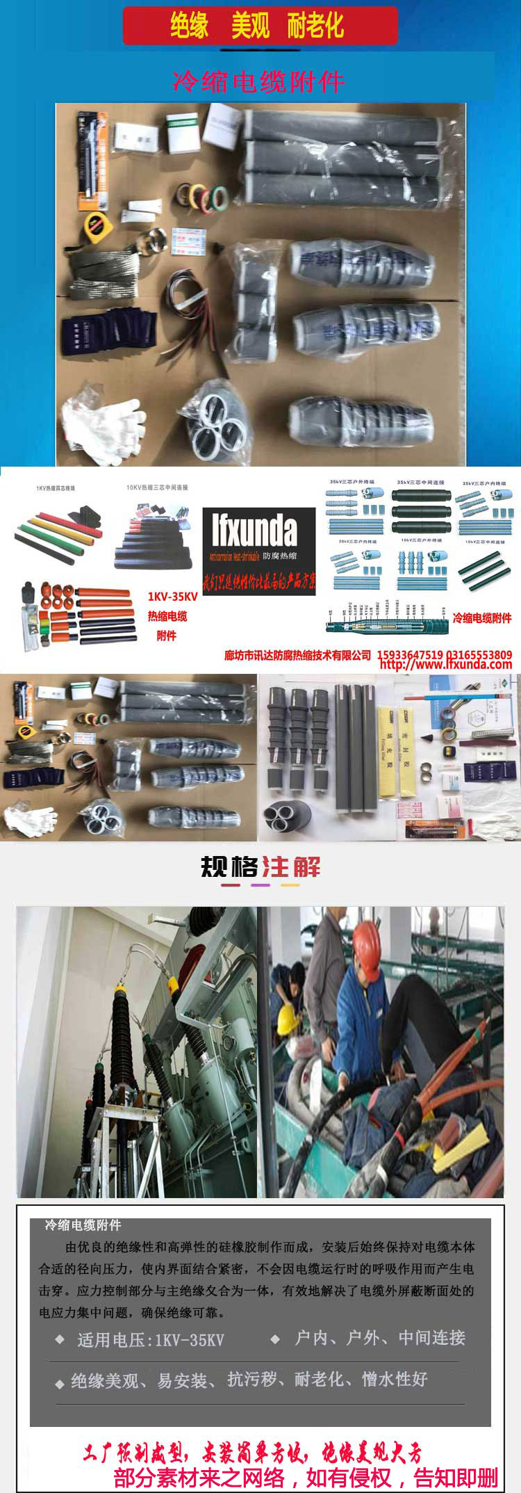 冷縮電纜終端頭,獨特的材料配方和制造工藝,使之緊密貼附電纜主絕緣, 對電纜本體提供恒定持久的徑向壓力, 局部放電量小,起始電壓高,絕緣沖擊水平高于現(xiàn)有標(biāo)準(zhǔn)的水平,防水密封性好, 與電纜本體同"呼吸"。