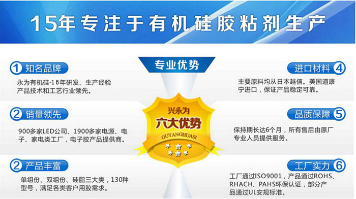 興永為硅膠15年專業(yè)生產(chǎn)led硅膠,導(dǎo)熱硅膠,防水密封膠,家電粘接膠,電子電器固定膠,rtv硅膠,灌封膠,汽車電器密封膠.雙組份導(dǎo)熱灌封膠。工廠通過iso9001,產(chǎn)品全部通過rohs.reach.phsa認(rèn)證.部分產(chǎn)品通過fda.ul認(rèn)證。