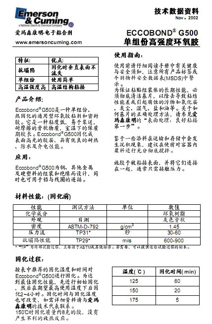 eccobondg500是一種單組份,熱固化的通用型環(huán)氧膠和密封膠。它是一種粘度低,易于泵送,乃摩擦的膏狀物質(zhì),抗坍塌性好,室溫保存期長。固化后表面光亮度好,高溫強度高,具有優(yōu)良的耐熱。防水和介電性能。專為銅,其他金屬及硬塑料的組裝和絕緣而設(shè)計,同時也可用于鉛與線圈的連接。在電感線圈行業(yè)有非常成熟的應用。