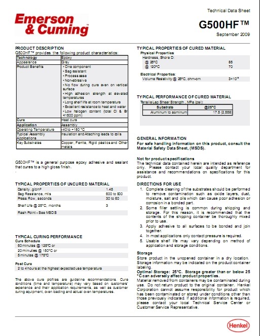 emersoncuming eccobond g500hf是一種不含鹵素 、單組份、熱固化的通用型環(huán)氧膠和密封膠。它是膏狀,抗坍塌性好,室溫保存期長。固化后表面光亮度好,具有優(yōu)良的耐熱。防水和介電性能。