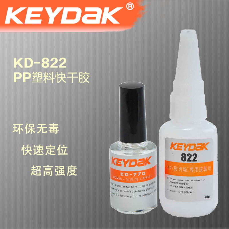 kd-822 pp專用膠粘劑 是專業(yè)針對小面積pp聚丙烯與pp聚丙烯材質(zhì),及pp聚丙烯與所有塑料、金屬、木材、陶瓷、石材、橡膠等不同材質(zhì)的快速粘接。其粘接強度可達撕裂材質(zhì)的超強效果,每平方厘米用上一滴膠液,拉伸強度可達8mpa,其優(yōu)良特性還表現(xiàn)在膠水完全固化后具有極高的剝離強度及耐沖擊強度。