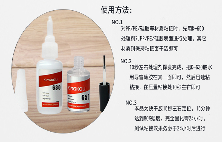 步驟4:接著定位,在接著面點(diǎn)上膠水后,對(duì)準(zhǔn)位置,立即進(jìn)行粘接,并保持至初步硬化定位為止,初步硬化時(shí)間為30秒左右,約15分鐘左右可以達(dá)到實(shí)用強(qiáng)度,24小時(shí)后膠水完全固化(固化速度取決于被粘接的基材,不同的溫度環(huán)境下,不同基材的固定時(shí)間會(huì)有相應(yīng)的差別,請(qǐng)以實(shí)際粘接情況為準(zhǔn),以上僅供參考)。
