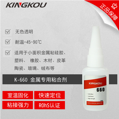 k-660是景固膠業(yè)針對金屬材質(zhì)粘接而研發(fā)的一款專用型瞬間接著劑 ,常溫下即可使用不需要加熱或加壓,較高強(qiáng)度,適用接著常見金屬 如磁鐵、不銹鋼、鋁合金、銅、合金等, 及金屬與塑料、硅橡膠、皮革、陶瓷、布料、木材等多種基材的粘接都能達(dá)到較高的粘接強(qiáng)度,有些也可用于結(jié)構(gòu)粘接。本產(chǎn)品性能穩(wěn)定,膠層透明無色、白化程度低,粘接面清潔美觀,耐濕熱老化,瞬間固化,數(shù)秒鐘內(nèi)即可粘牢,無須持久等待,能長期保持良好的粘合效果;無揮發(fā)性有害成分,膠液固化后環(huán)保通過sgs認(rèn)證。