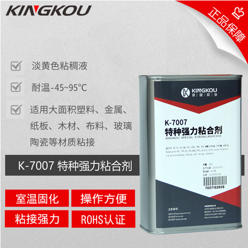 景固kingkou k-7007特種強力粘合劑 系復(fù)合型樹脂膠水,主要針對不同塑料、金屬、木材、絨布、陶瓷、石材、玻璃等材質(zhì)的大面積粘接。該膠水常溫固化,使用方便,可機器涂膠、點膠以及人工施膠,膠水完全固化后呈淡黃色軟質(zhì)狀態(tài),防水、耐高溫、耐腐蝕、耐酸 堿 ,粘接強度高,膠水環(huán)保,符合rohs環(huán)保標(biāo)準(zhǔn)。