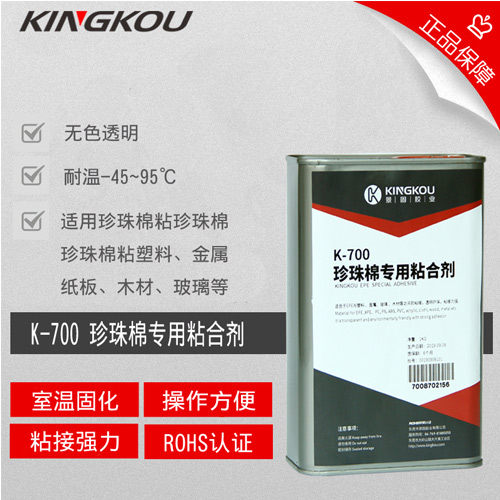 景固kingkou k-700 epe珍珠棉專(zhuān)用粘合劑 系景固膠業(yè)為取代熱熔膠粘接珍珠棉而研發(fā)的一款單組份,常溫固化粘合劑 ,完全避免了熱熔膠的高溫粘接、長(zhǎng)期變黃、強(qiáng)度低等缺點(diǎn)。使用方便,常溫粘接、固化后的膠層無(wú)色透明,無(wú)氣味、耐高溫、粘接強(qiáng)度高,可達(dá)基材破而不脫膠的效果。膠水通過(guò)rohs環(huán)保認(rèn)證!