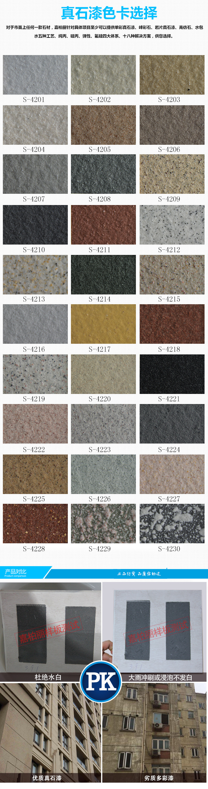 真石漆花崗巖涂料裝飾性強(qiáng)具有仿天然石材、大理石、花崗巖的厚漿型涂料。自然色澤,具有天然石材的質(zhì)感,各種線格設(shè)計(jì),能提供各種立體形狀的花紋結(jié)構(gòu),能從視覺上彰顯整個(gè)建筑的高雅與莊重之美 ,是外墻干掛石材最佳替代品。其次,外墻采用石材干掛將加載上千噸額外負(fù)擔(dān),嚴(yán)重危及生命財(cái)產(chǎn)。真石漆用料4-5㎏/㎡,僅占石材重量的1/30,附著力強(qiáng),不會(huì)像石材整體脫落,有效保障安 全。最后嘉柏麗涂料公司所生產(chǎn)的真石漆使用壽命可長達(dá)15年,使用壽命比一般涂料油漆長。