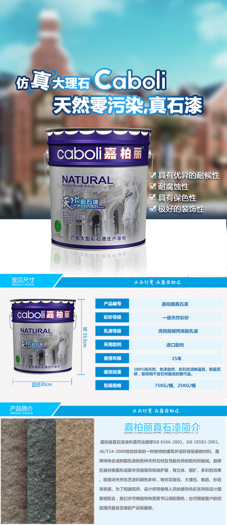 嘉柏麗涂料是一家有豐富研究真石漆涂料經(jīng)驗(yàn)的涂料企業(yè)。真石漆主要采用各種顏色的天然石粉 配制而成,應(yīng)用于建筑外墻的仿石材效果,因此又稱液態(tài)石。真石漆裝修后的建筑物,具有天然真實(shí)的自然色澤,給人以高雅、和諧、莊重之美感,適合于各類建筑物的室內(nèi)外裝修。特別是在曲面建筑物上裝飾,生動(dòng)逼真,有一種回歸自然的效果。真石漆具有防火、防水、耐酸 堿 、耐污染。無毒、無味、粘接力強(qiáng),永不褪色等特點(diǎn),能有效地阻止外界惡劣環(huán)境對建筑物侵蝕,延長建筑物的壽命,由于真石漆具備良好的附著力和耐凍融性能,因此適合在寒冷地區(qū)使用。