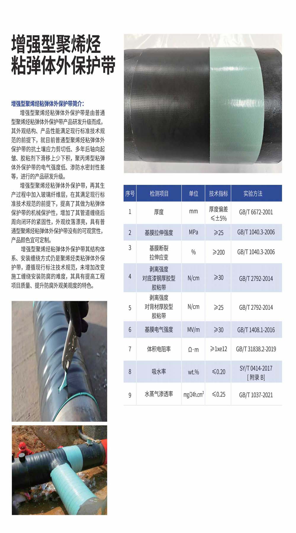 增強(qiáng)型聚烯烴粘彈體外保護(hù)帶,再其生產(chǎn)過程中加入玻璃纖維層,在其滿足現(xiàn)行標(biāo)準(zhǔn)技術(shù)規(guī)范的前提下,提高了其做為粘彈體保護(hù)帶的機(jī)械保護(hù)性,增加了其管道纏繞后周向閉環(huán)的緊固性,外觀紋落漂亮,具有普通型聚烯烴粘彈體外保護(hù)帶沒有的可觀賞性,產(chǎn)品顏色宜可定制。