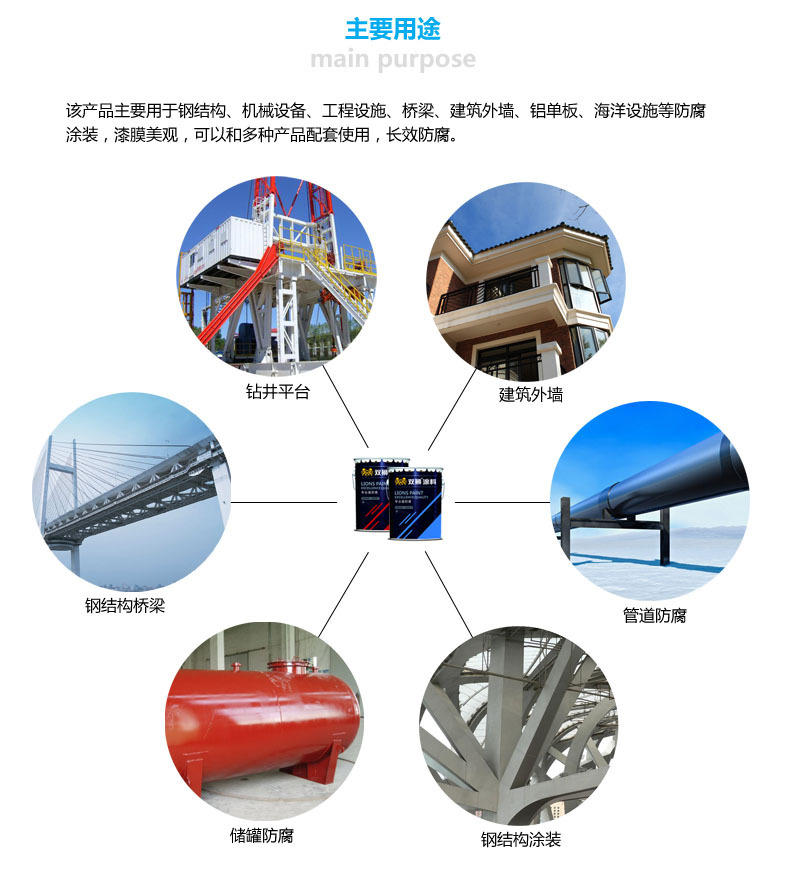 漆膜堅(jiān)韌,具有優(yōu)異的附著力和良好的耐久性、耐水性、耐堿 性,防腐性能優(yōu)異,裝飾效果良好。廣泛用于建筑廠房、石化裝備等鋼結(jié)構(gòu)表面做防腐和高性能裝飾面漆。