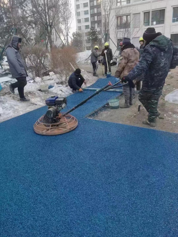攤鋪膠黏劑 ,噴撒彩色顆粒,收集多余顆!B續(xù)同步完成。