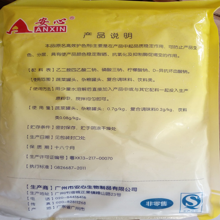 產品說明;本品主要是在產品中起品中起品質穩(wěn)定作用,可防止產品變色、分層,具有使產品顏色穩(wěn)定耐曬、抑制酶促褐色變的作用。