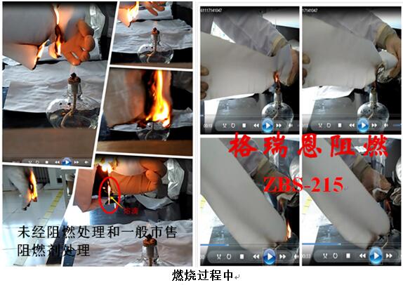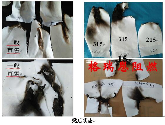 *格瑞恩團隊研發(fā)的zbs-215/ zbs-315體系處理后的織物觸火可燃,燃燒火勢小,伴有少量白煙,不會出現(xiàn)熔滴現(xiàn)象,且離火立即自熄或3s內(nèi)自熄。而通阻燃劑 處理后的織物觸火時易燃,燃燒火勢大,伴有濃濃黑煙或熔滴,且離火不能自熄。