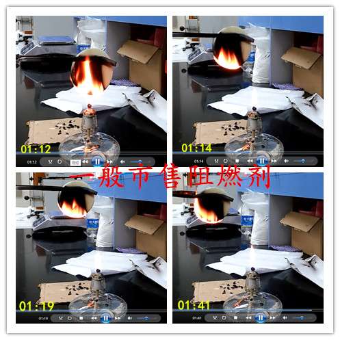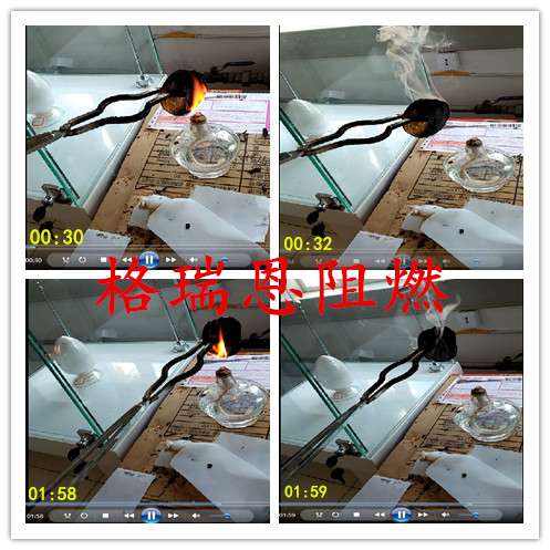 格瑞恩zbs-2131處理過的upr觸火燃燒火勢小,煙少,離火1-2s自熄,阻燃性能較高;一般市售阻燃劑 ,觸火燃燒火勢大,濃黑煙,離火長時間不自熄,阻燃性能差。