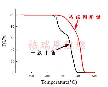 從熱重分析圖可知,格瑞恩zbs-2131處理過的upr熱分解起始溫度大約在300℃左右,在390℃之后快速分解,熱穩(wěn)定性較好;而一般市售阻燃劑 處理過的upr在245℃左右就已開始分解,在300℃左右分解緩慢,溫度大于300℃后一般市售阻燃劑 處理過的upr樣品迅速分解了,熱穩(wěn)定性差。