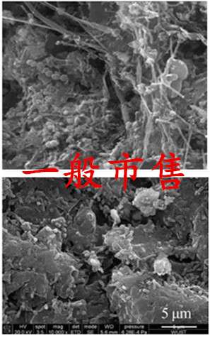 一般市售阻燃劑 燃燒后的殘余物經(jīng)電鏡掃描圖中碳層疏松,不能有效隔絕氧氣和熱量的傳遞,疏松的碳層不利于阻燃。