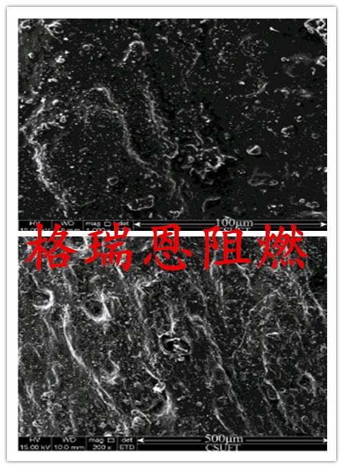 格瑞恩zbs-2131處理過的upr產(chǎn)品燃燒后的殘余物經(jīng)電鏡掃描圖中可看到致密的碳層,覆蓋在材料表面,不僅可阻隔氧氣,還可抑制熱量向基材upr傳遞,阻燃效率高。