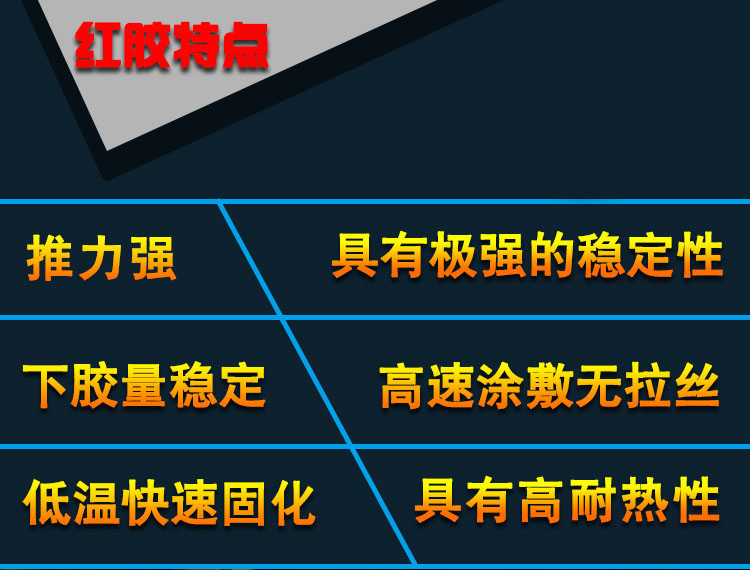 貼片紅膠是單一組分環(huán)氧樹脂膠粘劑 具有優(yōu)良的耐熱沖擊性能和電氣性能,使用安 全,完全符合環(huán)保要求,超高速微少量涂敷仍可保持沒有拉絲、溢膠、塌陷的穩(wěn)定形狀,其“剪切稀化”粘度特性和低吸濕性,非常適合應(yīng)用于常溫孔版印刷的smt工藝。