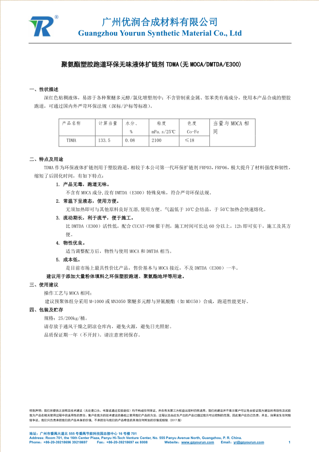 以上是廣州優(yōu)潤合成材料有限公司廠家直供環(huán)保液體moca-聚氨酯塑膠跑道環(huán)保無味液體擴鏈劑tdma的詳細信息,如果您廣州優(yōu)潤合成材料有限公司廠家直供環(huán)保液體moca-聚氨酯塑膠跑道環(huán)保無味液體擴鏈劑tdma的價格、廠家、型號、圖片有什么疑問, 請 聯系供應商 或 請供應商聯系我