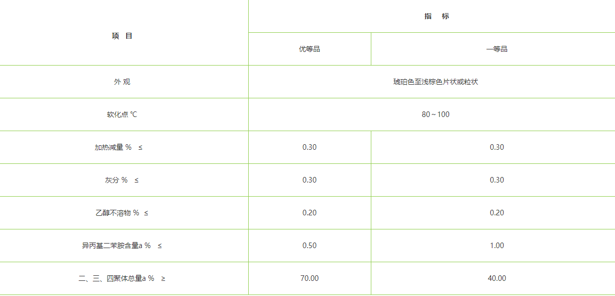 性狀:琥珀色至淺棕色片狀或粒狀。無毒。不溶于水,溶于苯、氯仿、丙酮及二硫化碳。微溶于石油烴。