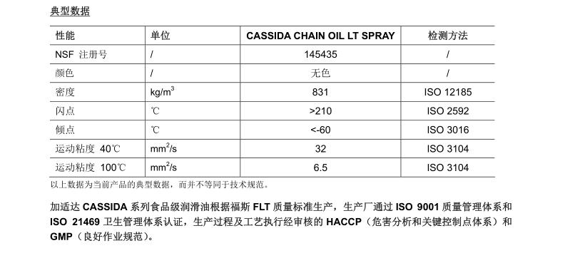 噴劑 是特別為食品冷凍設(shè)備內(nèi)傳送機(jī)械的潤滑而研制的全合成高性能抗磨鏈條油。此類產(chǎn)品以合成基礎(chǔ)油和精選添加劑 精心調(diào)配而成,完全滿足食品行業(yè)的嚴(yán)苛要求。加適達(dá)食品級鏈條油
