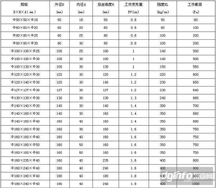 橡膠彈簧外形尺寸及技術(shù)參數(shù)表: