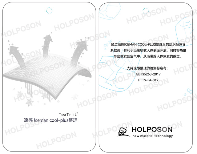 HOLPOSON® Iceman COOL-PLUS 是本公司以超細(xì)云母粉 為主,并運(yùn)用萃取技術(shù),經(jīng)科學(xué)精心開發(fā)研制的紡織品用后整理劑 。它能提高織物的熱導(dǎo)系數(shù),迅速吸收人體表面汗液,同時將熱量導(dǎo)出散發(fā)到空氣中,從而帶給人體涼爽的感覺。本產(chǎn)品還具有一定的防紫外線效果。主要適用于內(nèi)衣面料、襯衫面料、床上用品面料、登山服、高爾夫服裝、休閑系列服裝面料、各種服飾面料、家用紡織品面料等。