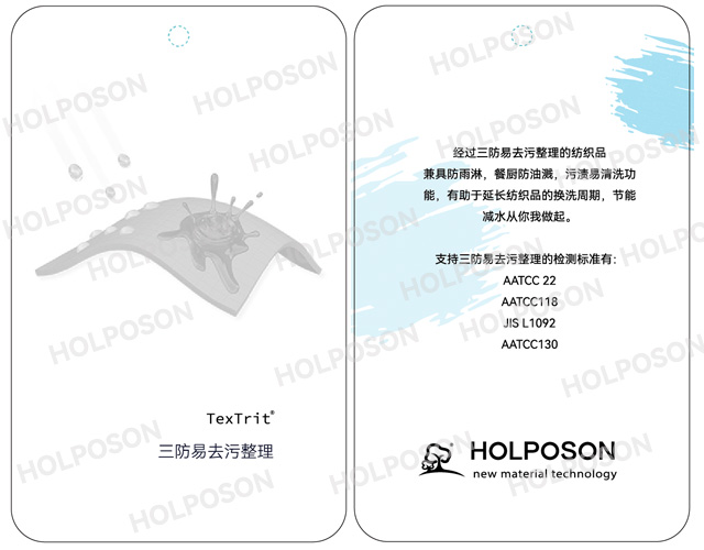 HOLPOSON® Smart Clean-T 親水易去污整理劑 HOLPOSON® Smart Clean-T 是經(jīng)過特殊改性聚酯類親水易去污整理劑 ,能夠賦予加工織物良好的親水,抗靜電,吸濕速干,蓬潤性等性能,且耐洗性達(dá)50次以上(JIS L0217. 103法,連續(xù)洗滌法)經(jīng)過易去污整理后的紡織品面料,在一定程度上可以清水擦除所沾污漬,如:醬油,番茄醬,玉米油,圓珠筆油污等。滿足家庭主婦對淺色衣物易打理易清潔的要求。使難去除、易殘留的臟污,可以去除干凈,達(dá)到污所不落,節(jié)能去污。HOLPOSON® Smart Clean-T 適用于天然纖維、合成纖維及其混紡織物,目前易去污整理可用于開發(fā)淺色系列的童裝面料,羽絨服面料,沙發(fā)面料,工裝,職業(yè)裝,襯衫,白T恤等等。