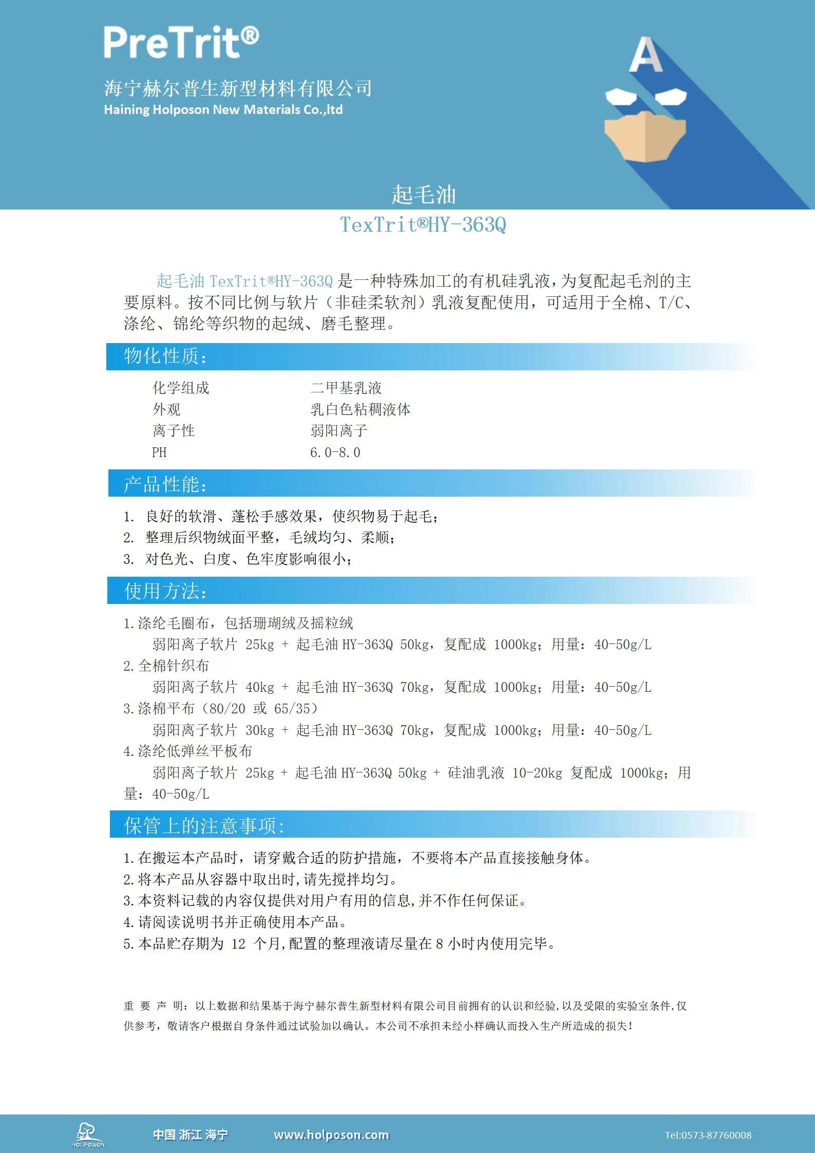 起毛油PreTrit®HY-363Q是一種特殊加工的有機硅乳液,為復配起毛劑 的主要原料。按不同比例與軟片(非硅柔軟劑 )乳液復配使用,可適用于全棉、T/C、滌綸、錦綸等織物的起絨、磨毛整理。