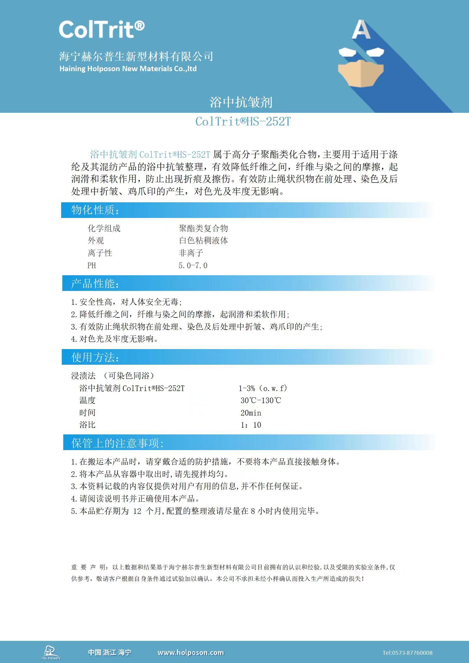 浴中抗皺劑 ColTrit® HS-252T屬于高分子聚酯類化合物,主要用于適用于滌綸及其混紡產(chǎn)品的浴中抗皺整理,有效降低纖維之間,纖維與染之間的摩擦,起潤滑和柔軟作用,防止出現(xiàn)折痕及擦傷。有效防止繩狀織物在前處理、染色及后處理中折皺、雞爪印的產(chǎn)生,對色光及牢度無影響。