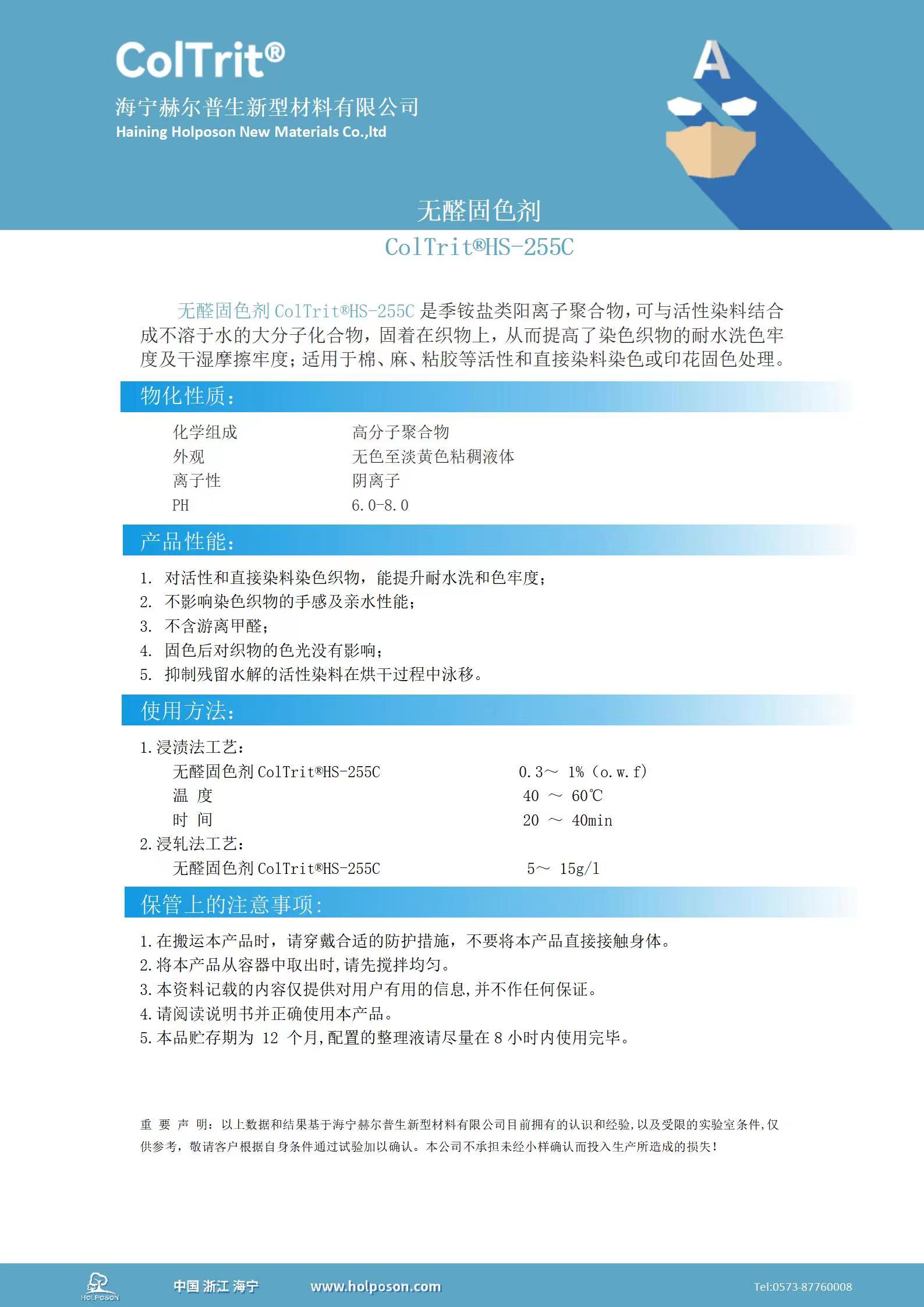 無醛 固色劑 ColTrit® HS-255C是季銨鹽 類陽離子聚合物,可與活性染料結(jié)合成不溶于水的大分子化合物,固著在織物上,從而提高了染色織物的耐水洗色牢度及干濕摩擦牢度;適用于棉、麻 、粘膠等活性和直接染料染色或印花固色處理。