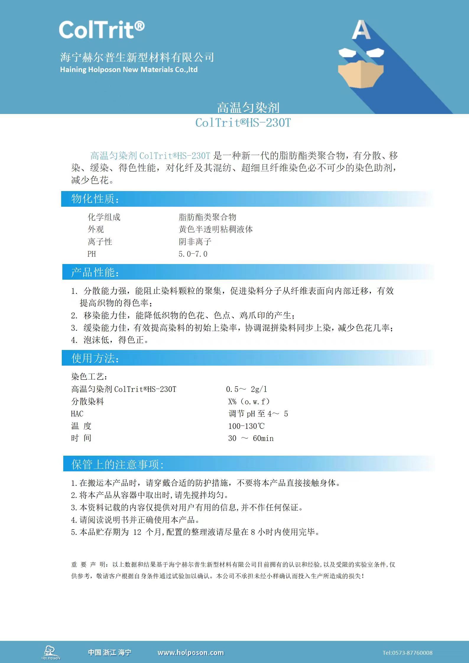 高溫勻染劑 ColTrit®HS-230T是一種新一代的脂肪酯類聚合物,有分散、移染、緩染、得色性能,對(duì)化纖及其混紡、超細(xì)旦纖維染色必不可少的染色助劑 ,減少色花。