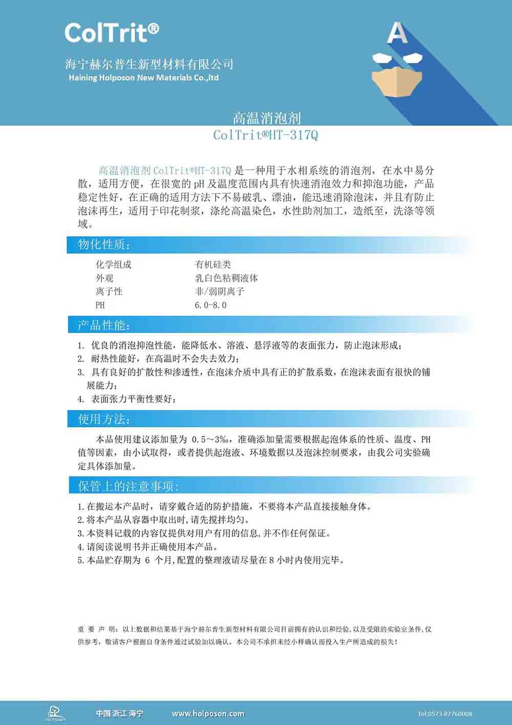 高溫消泡劑 ColTrit®HT-317Q是一種用于水相系統(tǒng)的消泡劑 ,在水中易分散,適用方便,在很寬的pH及溫度范圍內(nèi)具有快速消泡效力和抑泡功能,產(chǎn)品穩(wěn)定性好,在正確的適用方法下不易破乳、漂油,能迅速消除泡沫,并且有防止泡沫再生,適用于印花制漿,滌綸高溫染色,水性助劑 加工,造紙至,洗滌等領(lǐng)域。