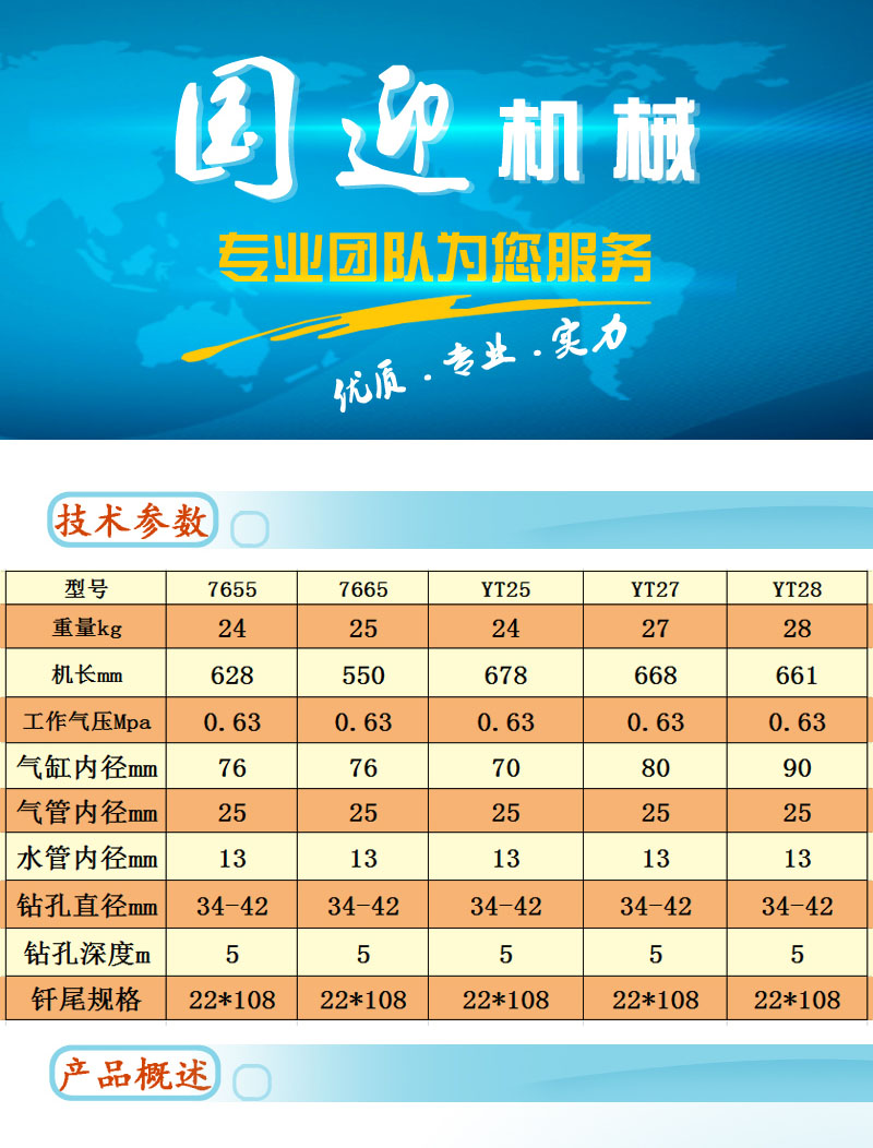 yt27氣腿式鑿巖機高效輕型,適宜在中硬或堅硬(f=8-18)巖石上濕式鉆鑿向下和傾斜鑿孔。