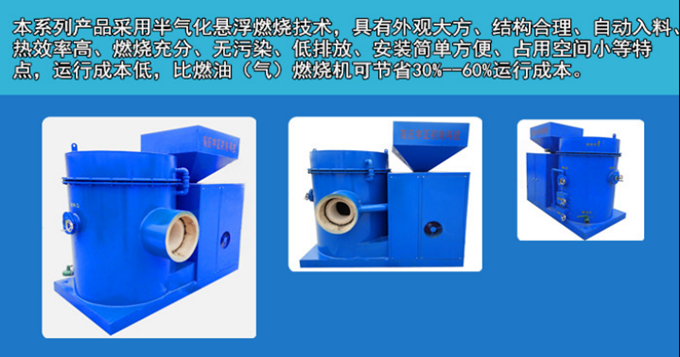 本系列產(chǎn)品采用半氣化懸浮燃燒技術(shù),具有外觀大方、結(jié)構(gòu)合理、自動(dòng)入料、熱效率高、燃燒充分、無污染、低排放、安 裝簡單方便、占用空間小等特點(diǎn),運(yùn)行成本低,比燃油(氣)燃燒機(jī)可節(jié)省30%--60%運(yùn)行成本。