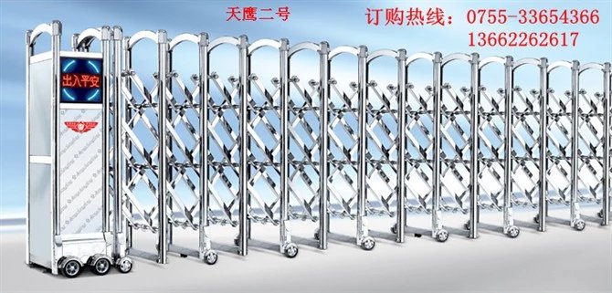 4、智能紅外線探頭防碰撞裝置:門體在關(guān)閉過程中遇人或異物30-50cm可自動(dòng)返回運(yùn)行,從而保障車輛及行人 的安 全。 標(biāo)準(zhǔn)結(jié)構(gòu):門排內(nèi)空(即前后相臨兩大彎主管之間的距離,不含主管尺寸)采用伸縮門標(biāo)準(zhǔn)尺寸320mm(參照國(guó)外技術(shù)),保證交叉管最固,并大大減少運(yùn)行噪音。
