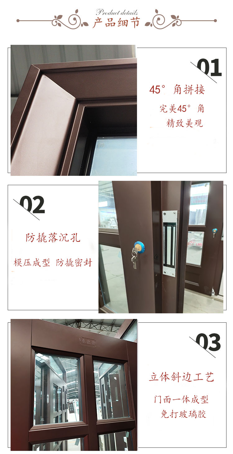 防盜、門框采用強大寬邊設(shè)計,雙層造型,不僅增添了門框強度,而且增添了美觀度。嵌入式隱_形_防撬邊,雙重防撬功能,配有加厚型的主鎖、天鎖、地鎖齊全,上下都有鎖點,防盜安 全性能好,防鉆、防撬、防割、防撞、防技術(shù)功能已達到了高標(biāo)準(zhǔn), 讓客戶無后顧之憂。