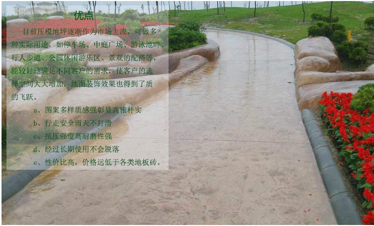 上海九路景觀工程有限公司供應(yīng):壓花地坪,壓模地坪,水泥壓花,水泥壓膜,壓膜水泥,混凝土壓花,混凝土壓模,壓花地面,壓花路面,壓花道路,壓花水泥,壓花混凝土,壓模地面,壓模路面,壓模道路,壓模水泥,壓;炷,壓印地坪,壓印混凝土,水泥壓印,壓印水泥,藝術(shù)地坪,彩色混凝土,裝飾混凝土,仿石地坪,仿木地坪,仿木地面,仿木路面,仿木混凝土,混凝土仿木,仿石地面,仿石混凝土,混凝土仿石,模壓地坪,模壓混凝土,模壓路面,彩色水泥,仿石壓模地坪,壓模仿石地坪,透水地坪,透水地面,透水路面,透水道路,透水混凝土,無砂混凝土,彩色地坪,彩色地面,彩色路面,彩色道路,藝術(shù)彩坪,壓磨地坪,歡迎垂詢!