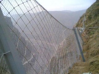 被動(dòng)防護(hù)是由鋼絲繩網(wǎng)、環(huán)形網(wǎng)、(需攔截小塊落石時(shí)附加一層鐵絲格柵)、固定系統(tǒng)(錨桿、拉錨繩、基座和支撐繩)減壓環(huán)和鋼柱四個(gè)主要部分構(gòu)成。鋼柱和鋼絲繩網(wǎng)連接組合構(gòu)成一個(gè)整體,對(duì)所防護(hù)的區(qū)域形成面防護(hù),從而阻止崩塌巖石土體的下墜,起到邊坡防護(hù)作用。